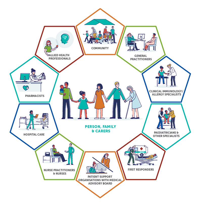 Shared care puts the person with an allergy at the centre of their care. They are supported by healthcare professionals, patient support organisations and the community to receive the right care, at the right time, from the right healthcare professional(s), in the right place.